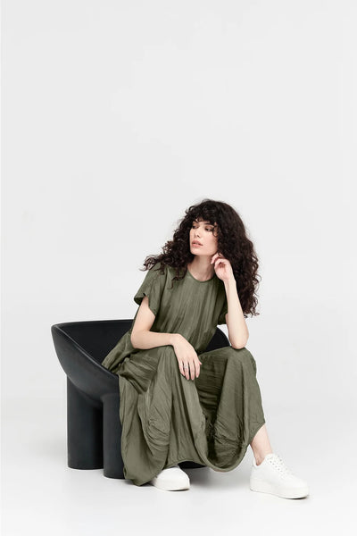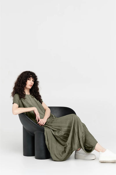 The contemporary silhouette of the Lapse Dress has been refabricated this season redefining a previous season favourite. Voluminous yet controlled in shape, hem panels taper this piece in creating a look that is both comfortable yet relevant. A tie secured at the waist will add more control to this silhouette - cinching it in and allowing the fullness to really be appreciated. Also featuring an internal tie secured at the waistline that can be tied to a small rouleau loop that is found in the front hem of the dress. This allows the hem to be drawn up and gives the dress a new silhouette. The washed, crushed look making it easy roll up and put in your suitcase for a trip away.